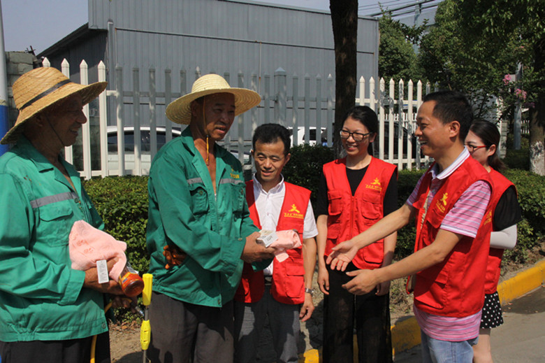 7月16日,匯才紅木的黨員們?cè)谥Р繒浶旄桓鶐ьI(lǐng)下,拿著解暑飲料、毛巾等來到梧桐街道工業(yè)園區(qū)、誠(chéng)盛小區(qū)、東方紅小區(qū),為那里的環(huán)衛(wèi)工人、“馬路天使”送去清涼。
