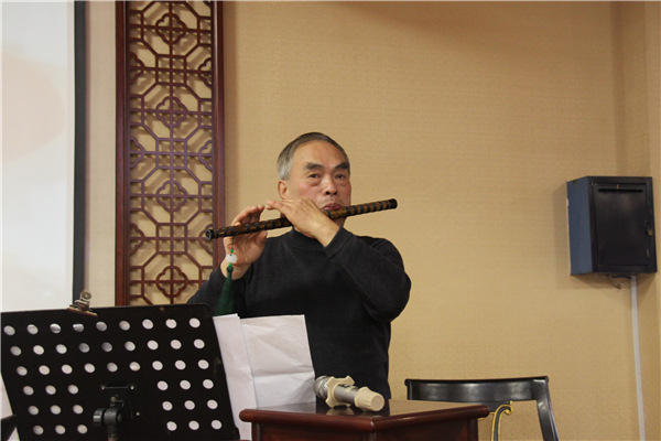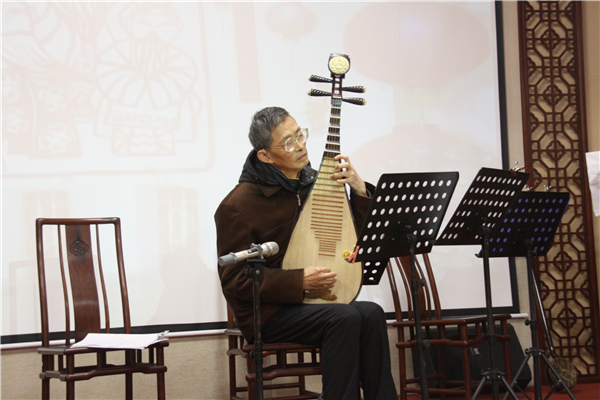 下午2時許,演出在《金龍狂舞鬧新春》器樂合奏中拉開序幕。本次演出共上演6個節(jié)目,其中由王偉江老師表演的笛子獨奏《春到湘江》和顏耀邦老師表演的琵琶獨奏《春江花月夜》博得了全場熱烈的掌聲。