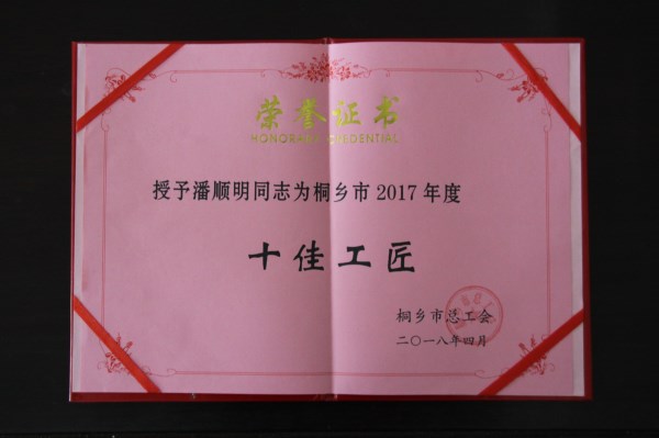 他技術(shù)能力過硬,為人謙虛,兢兢業(yè)業(yè)做事,踏踏實實做人,刻苦鉆研,精益求精,創(chuàng)建“潘順明高技能人才工作室”。嚴(yán)格要求自己,加強(qiáng)學(xué)習(xí),不斷提高自身修養(yǎng)和思想認(rèn)識,在工作中積極主動,充分發(fā)揮先鋒模范帶頭作用。他的工作態(tài)度和管理能力,以及深入一線,十幾年如一日的堅持,獲得了公司全體員工的認(rèn)可。今年,獲得桐鄉(xiāng)市“十佳工匠”榮譽(yù)稱號。